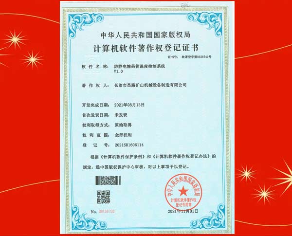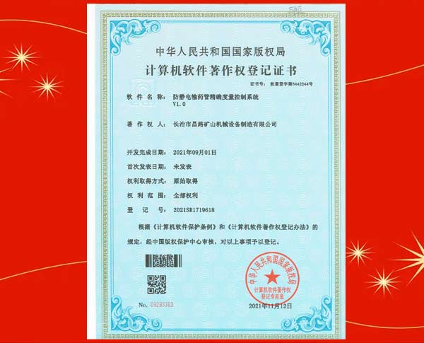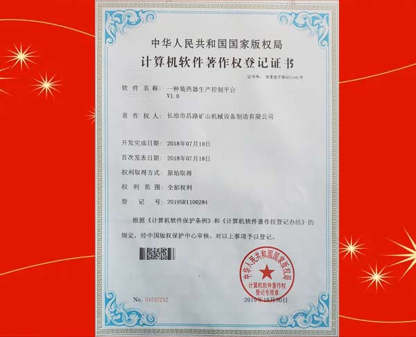 榮獲裝藥器生產(chǎn)控制平臺(tái)著作權(quán)登記證書