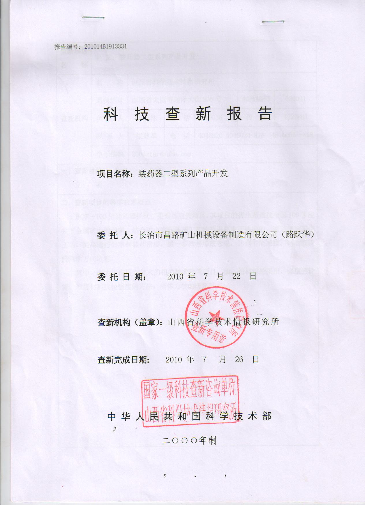 裝藥器二型開發(fā)科技查詢報告 國家一級科技單位